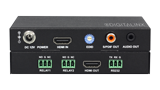The DL-S41-H2 is a slimline HDMI 2.0b auto switcher with four HDMI video inputs and one HDMI output. This switcher supports HDMI video resolutions up to 4Kx2K@60Hz 4:4:4, HDR, and multichannel audio. In addition to passing EDID information from the display, there are multiple built-in EDID settings to simplify an installation. The switcher will de-embed digital stereo audio to provide an analog audio source for an existing audio system. The switcher also supports audio return channel (ARC) for transmitting audio back to HDMI input and audio output ports from display device.