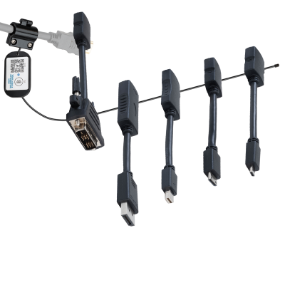 Don't be a loser - Eliminate your customer's panic & expense when presentation adapters go missing or get lost! Our patent-pending tensile aircraft strength ring & clamp locks on the HDMI cable going to your display keeping any adapter you may need is at your fingertips. Read more...