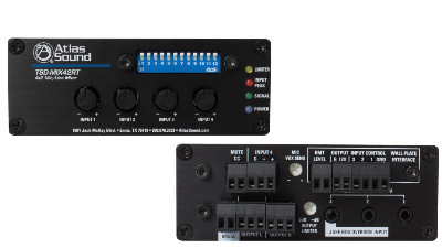 The Atlas Sound TSD-MIX42RT 4x2 mic/line mixer is ideal for applications where paging, priority music override and/or remote input selection with level control are required. Use alone or in conjunction with amplifiers in meeting rooms, digital signage, luxury suites, and other applications requiring versatile, stereo or mono multi source mix control.
