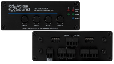 The TSD-ML22VCA is a 2 input, 2 output true VCA with enhanced features including a high quality microphone pre amplifier. VCA's inserted prior to amplification provide a far more efficient solution than transformer-based attenuators for volume adjustment in high power music applications. The dual channel design can provide level control for two separate discrete zones or stereo sources and is perfect for use in sports bars, restaurants, hotels or other installations.