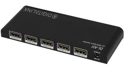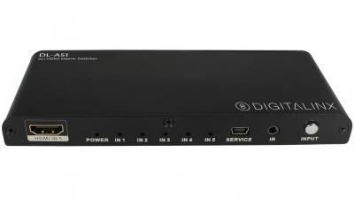 The DigitaLinx DL-A51 is a five input by one output slim HDMI matrix with Ultra HD 4K support. The DL-A51 is HDMI 2.0, HDCP 2.2, and DVI 1.0 compliant. The matrix switcher supports resolutions up to 4k/60Hz, 4:2:0, 8 bit deep color.