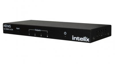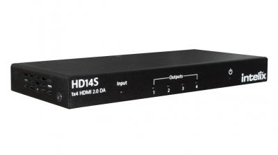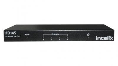 The Intelix HD14S is a 1x4 HDMI splitter with HDMI 2.0 and HDCP 2.2. The HD14S supports data rates up to 18Gbps and resolutions of 4K2K@60Hz (4:2:0). The HD14S features EDID management which provides multiple EDID options for various resolutions output and HDCP encryption between all devices, ensuring the HDMI source reliably outputs the correct content for the display.